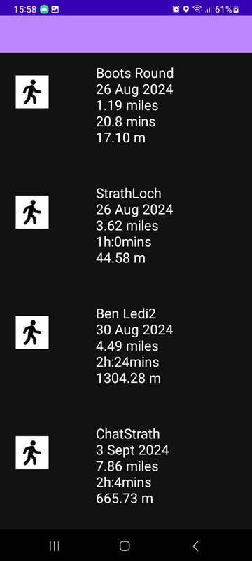 This app lets you track your exercise. You can select activities as walking or cycling. The app uses android gps running as a foreground service to allow continuous monitoring of your position. It records your altitude, speed and location. This can be shown on a google maps via the google maps api (with api key). The app also uses androidplot to display speed and altitude on a graph which is updated during the activity. Each trip can be save to local memory and can be recalled at a later date for review.