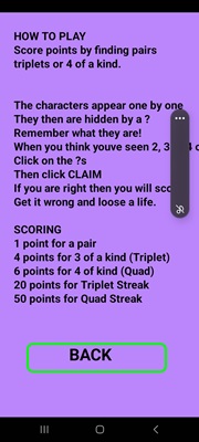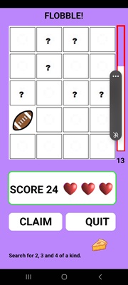 Flobble is a memory game. The game reveals the contents of a square for a short period of time. It then covers it and moves to the next square. Your job is to collect pairs, three-of-a-kinds and four-of-a-kinds. You get sequence bonuses which really mount up. There is a choice of icons, there are 16 levels to unlock with different game plays and there is a high score table.