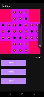 This one player classic is a puzzle. Remove the pegs one by one by jumping over a neighbour into a free space. The aim is to be left with just one peg in the centre.I wrote an algorithm to solve the puzzle and this is used in the hint option.